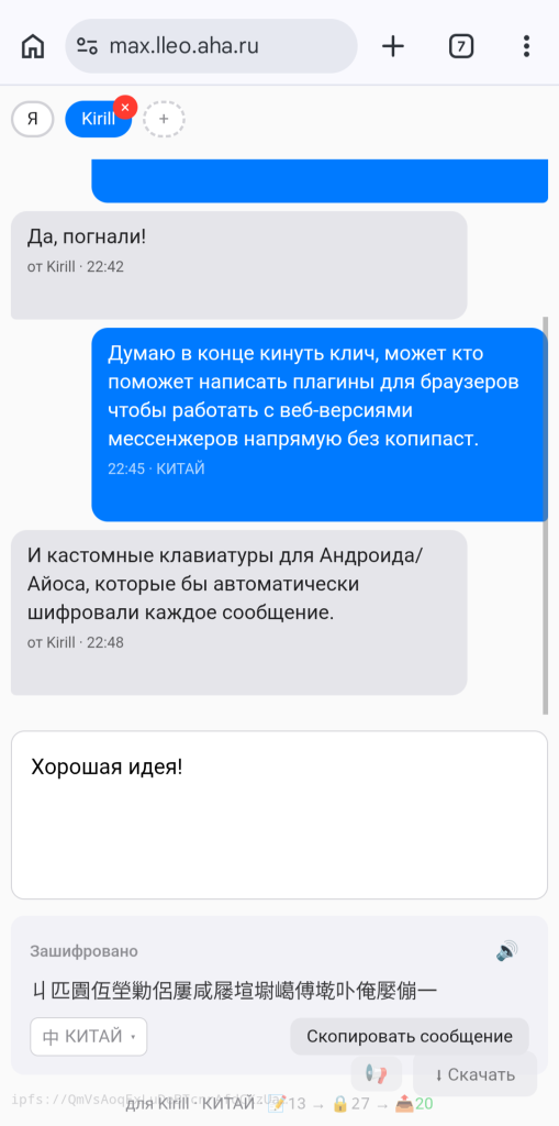 Представляем наш с Кириллом проект — утилиту, которая наконец-то делает мессенджер Макс абсолютно защищённым. И если бы только его! Ещё ВК, Телеграмм, Ватсап, email — любая ваша переписка с собеседником становится защищённой и недоступной для жуликов, а заодно ещё и красивой. Современная криптография, облеченная в понятную форму и недоступная никому, кроме вашего собеседника. Вот вам мой пригласительный ключ (мы нашли ради такого дела сайт, доступный в России):