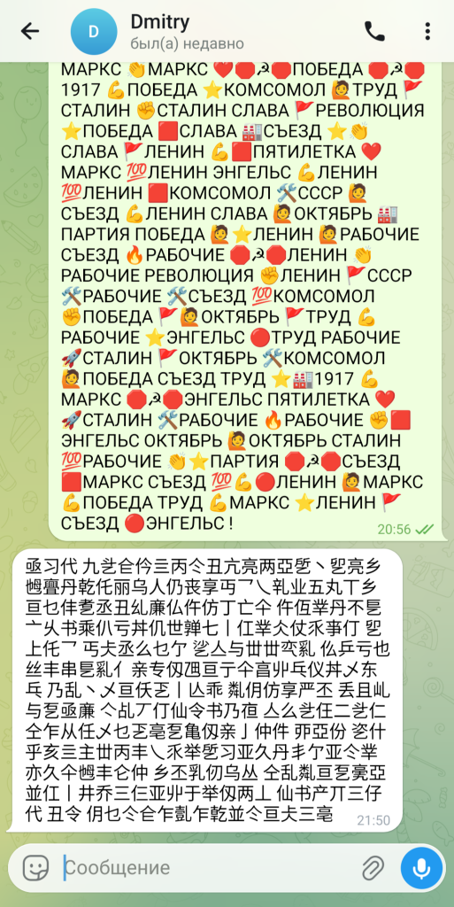 Вы используете сайт max.lleo.aha.ru для шифровки и расшифровки сообщений, обмениваясь с собеседником копипастами через любой канал связи, который пока ещё не заблокирован на вашем интернете. Жулики увидят только смайлики, крики души в стиле ZOV или СССР, пьяный бред, молитвы или китайские иероглифы — словарей несколько на выбор. Все остальное сделает современная криптография. Просто копируйте в окошко посланный вам текст или набирайте свой, выбрав абонента, чтобы скопировать ему. Интерфейс простой и красивый, разберётесь быстро.